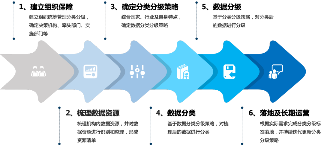 針對金融數據分類分級合規場景,可按照“建立組織保障-梳理數據資源-確定分類分級策略-數據分類-數據分級-落地及長期運營”六步驟開展,通過利用數據資產盤點和分類分級工具,從而理清金融系統數據量級、資產分布等,形成重要數據目錄,借助數據分布看板、數據訪問熱圖、數據流向圖等實現數據安全的合法合規、數據可視、風險可控、威脅可管、事件可溯。