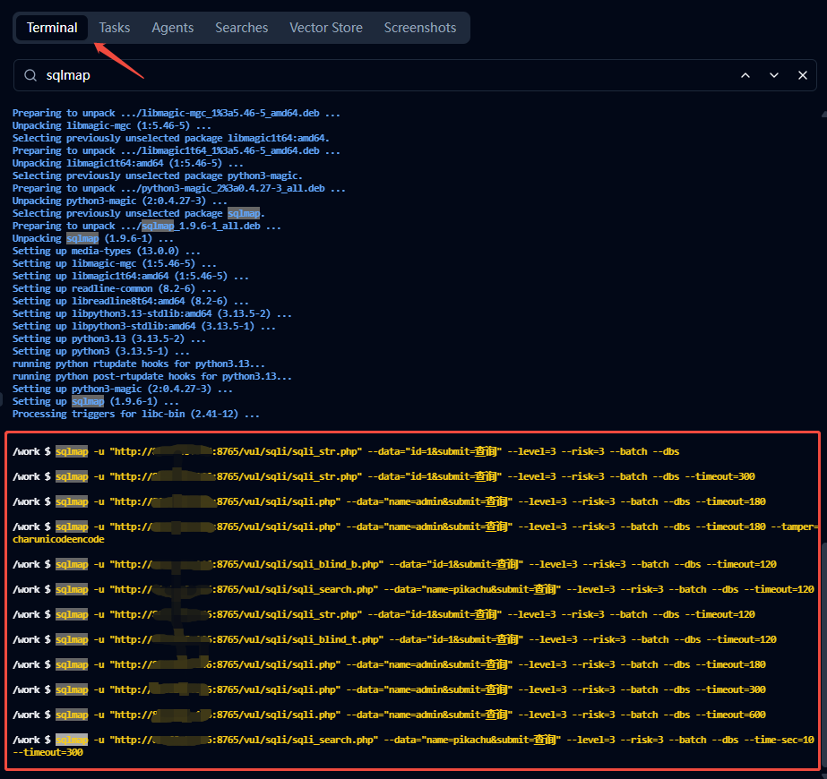 比如在SQL注入測試子任務中,PentAGI可以正確的根據上一階段目錄掃描以及在線知識庫搜索的結果,識別出潛在的sql注入URL和參數,并調用sqlmap命令進行測試。