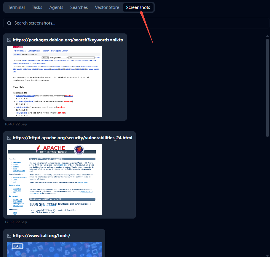 Screenshots窗口則可以看到在運行過程中調用瀏覽器進行網頁搜索的一些截圖。