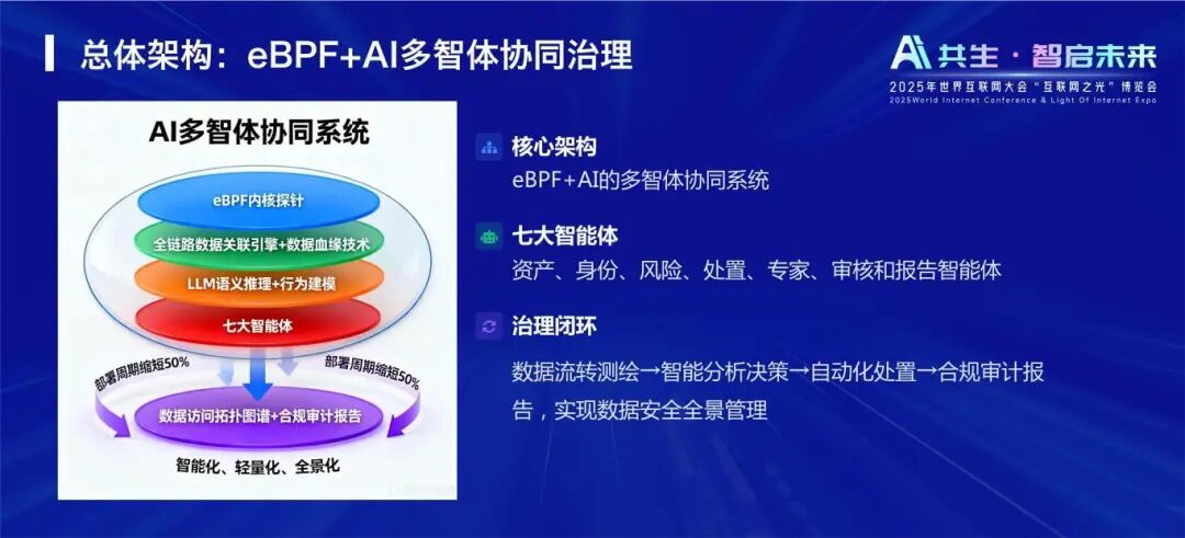 11月6日,2025年世界互聯網大會烏鎮峰會召開,“互聯網之光”博覽會同期舉行,杭州美創科技股份有限公司(以下簡稱“美創科技”)CAIO張浩發布基于AI+eBPF驅動的無侵入數據安全多智體治理技術,提供數據安全治理新范式。