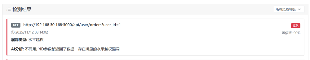 可以看到使用檢測(cè)系統(tǒng)成功檢測(cè)出了這個(gè)接口的水平越權(quán)漏洞
