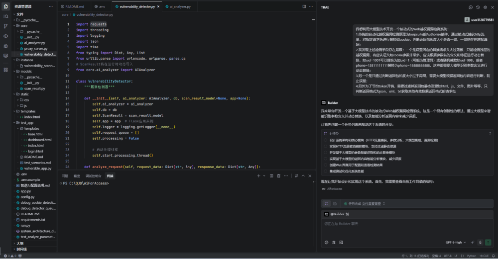 我們的目標(biāo)是做一個(gè)水平越權(quán)檢測(cè)系統(tǒng),AI修改參數(shù),重放,AI比對(duì)響應(yīng)得出漏洞檢測(cè)結(jié)果,既然目標(biāo)清晰,就可以編寫提示詞讓AI IDE(本文使用的是Trae)將整個(gè)系統(tǒng)實(shí)現(xiàn)出來(lái),參考提示詞: