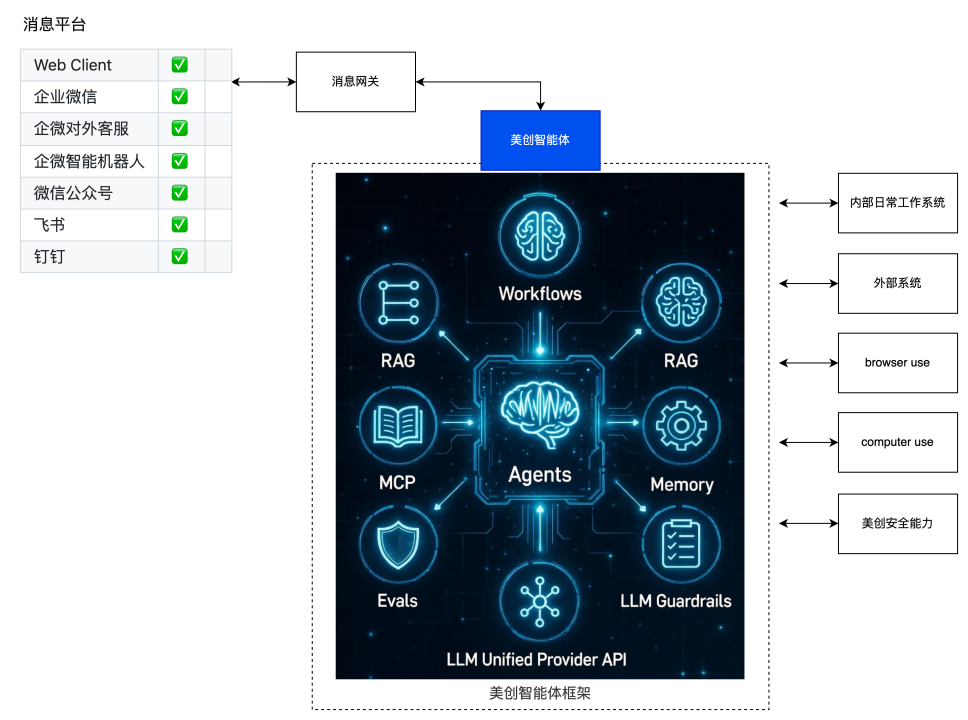 美創(chuàng)智能體框架不僅支持多種大模型統(tǒng)一調(diào)用,還實(shí)現(xiàn)了企業(yè)級(jí)安全、可控、可評(píng)估、可落地的完整閉環(huán),是我們所有AI員工的“操作系統(tǒng)”與“數(shù)字神經(jīng)網(wǎng)絡(luò)”。