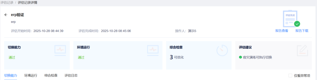 在切換啟動前,平臺自動對資源狀態、網絡連通性、應用健康度等進行全面、深度檢查,提前識別潛在隱患,為切換成功筑牢安全基石。