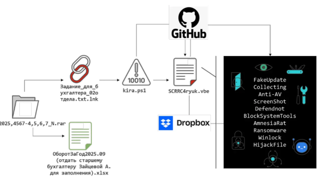 安全研究人員披露,一場針對俄羅斯用戶的多階段惡意攻擊活動正在活躍傳播,該行動通過社會工程手段結合濫用GitHub和Dropbox等合法云服務,實現對系統的隱蔽入侵和勒索軟件投放。FortiGuard Labs分析指出,攻擊鏈始于偽裝成正常商務文件的誘餌文檔,用戶打開后會看到虛假任務或提示信息,而真實的惡意腳本在后臺悄然執行并建立持久控制。該攻擊最顯著的特征在于利用名為Defendnot的工具,該工具原本用于安全研究,旨在演示Windows安全中心信任機制的缺陷。攻擊者將其武器化,用于直接關閉Microsoft Defender防護功能,從而在不依賴漏洞利用的情況下“合法”解除系統安全防線,為后續惡意負載鋪平道路。