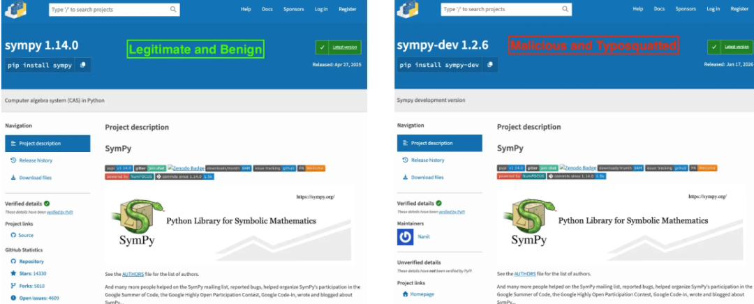 研究人員發現一款名為sympy-dev的惡意PyPI包,該包仿冒熱門Python符號數學庫SymPy,后者月下載量達8500萬次,攻擊者復制了SymPy的項目描述及品牌元素,以此誘導用戶誤安裝。該惡意包于2026年1月17日發布4個版本(1.2.3至1.2.6),均含惡意代碼,維護者標注為Nanit,上線首日下載量即突破1000次,雖下載量不等同于感染量,但已快速滲透至開發者及持續集成(CI)環境。包內惡意代碼注入下載器及內存執行程序到SymPy多項式代碼路徑,調用后會獲取遠程JSON配置、下載攻擊者控制的ELF負載,通過Linux內存文件描述符技術執行,減少磁盤痕跡,實測下載的負載為XMRig加密挖礦程序,通過TLS連接礦池端點,配置及負載均來自兩個指定控制服務器。